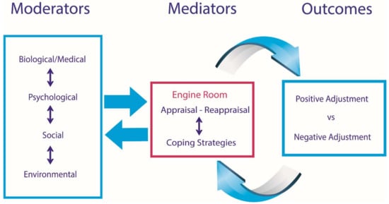 In SCIAM, mediators involve appraisals (e.g., perceived susceptibility, perceived threat, and perceived ability to cope, often assessed using appraisal/self-efficacy measures) and coping strategies that can be adaptive (e.g., problem solving a challenge) or maladaptive (e.g., abuse of a substance, avoidance). Following the success or failure of a coping strategy after an appraisal, re-appraisal of the situation usually occurs, leading to no further action if all is well. If the problem remains unresolved, re-appraisal occurs, leading to additional adaptive coping or maladaptive coping strategies, such as negative emotional reactions and destructive behaviour. The relationship between mediators and moderators is believed to be dynamic, involving synergistic interactions [55], and as shown in Figure 1, SCIAM characterizes the process of mediation as incorporating both appraisal/re-appraisal and developing a coping strategy as the “engine room” of adjustment [22]. This is because it is believed this process contributes very substantially to the process of adjustment, empowering the person to adapt by employing appropriate appraisals and coping strategies. Self-efficacy is a recognized mediator [53]. It involves a person’s appraisals, expectations, and beliefs about executing a future task successfully [53] and has been shown to be a mediator of health outcomes [53,56,57]. The appraisal–reappraisal and coping strategy responses will also be influenced by moderators at various time periods, adding a further complexity that the model attempts to explain [58].