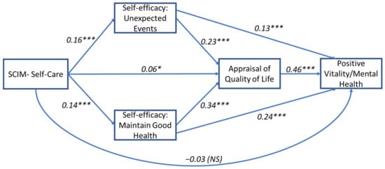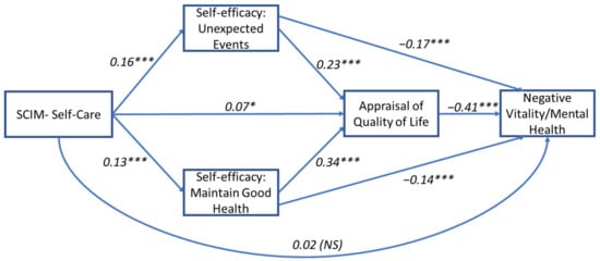 Figure 3. Mediation path model for the relationship between SCIM—Self-Care activities and positive vitality/mental health. Standardized regression coefficients (β) are presented for the direct paths. Model includes two parallel self-efficacy mediators (unexpected events and maintain good health) that are serially antecedent to a third mediator (self-appraisal of quality of life). Model is adjusted for age, sex, time since injury, and injury level. *** p < 0.001, * p < 0.05; NS, not significant.