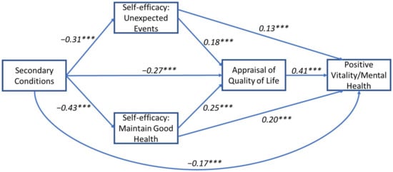Figure 5. Mediation path model for the relationship between secondary conditions and positive vitality/mental health. Standardized regression coefficients (β) are presented for the direct paths. Model includes two parallel self-efficacy mediators (unexpected events and maintain good health) that are serially antecedent to a third mediator (self-appraisal of quality of life). Model is adjusted for age, sex, time since injury, and injury level. *** p < 0.001.