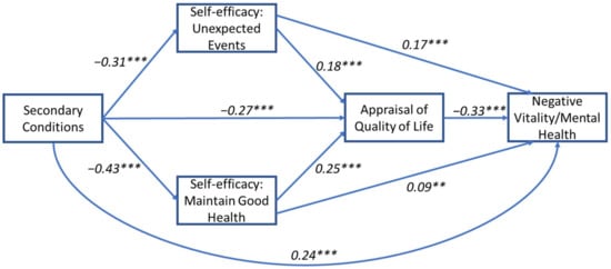 Figure 6. Mediation path model for the relationship between secondary conditions and negative vitality/mental health. Standardised regression coefficients (β) are presented for the direct paths. Model includes two parallel self-efficacy mediators (unexpected events and maintain good health) that are serially antecedent to a third mediator (self-appraisal of quality of life). Model is adjusted for age, sex, time since injury, and injury level. *** p < 0.001, ** p < 0.01.