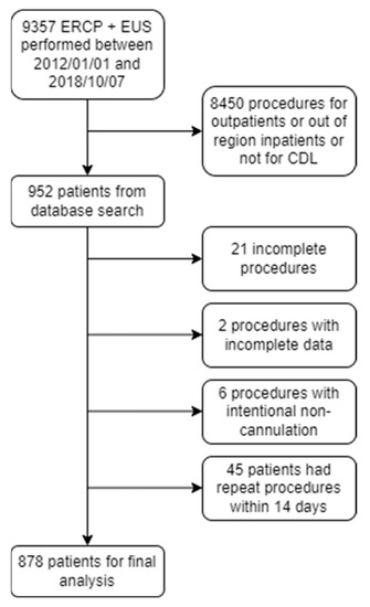 All adult in-patients (age ≥ 18 years) who underwent ERCP or EUS for suspected CDL at our center between 1 January 2012 and 7 October 2018 were identified. Out-patients were excluded given the low likelihood of having serial liver enzymes measured leading up to procedures. In-patients from outside our health region (and thus with incomplete access to electronic medical records) were also excluded. Patients with prior cholecystectomy, prior sphincterotomy, or indwelling biliary prostheses, and those undergoing ERCP or EUS for any indications other than suspected CDL (including cholangitis), were also excluded at the time of the initial database search. Any unsuccessful EUS or ERCP procedure was also excluded after manual review of the report.