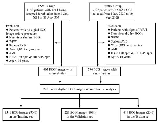 Flowchart of data collection and dataset creation. A total of 1714 ECGs of 1143 patients with PSVT and 5365 ECGs of 5107 control patients were collected. After exclusion of non-sinus-rhythm ECGs, WPW syndrome, serious AVB, wide QRS tachycardias, acute myocardial infarction, HR > 130 bpm, HR < 45 bpm and age < 14 years, a total of 2201 ECGs (407 ECGs for PSVT group and 1794 ECGs for control group) were included in this study. These ECGs were randomly divided into three datasets: a training set (n = 1541), validation set (n = 220) and testing set (n = 440).