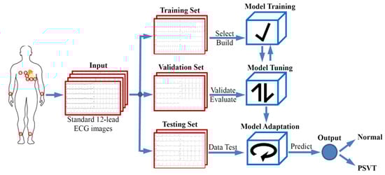 In total, 2201 ECG images were randomly allocated to the training set, validation set and testing set at a ratio of 7:1:2. None of the patients overlapped among these three groups. ECGs in the training set were used for training the model, ECGs in the validation set were used to adjust parameters and optimize the model, and the remaining 20% of ECGs comprised the testing set, which was used to assess the generalization ability of the model and evaluate the ability of a CNN-based model to detect PSVT. A schematic representation of the proposed method is given in Figure 2.