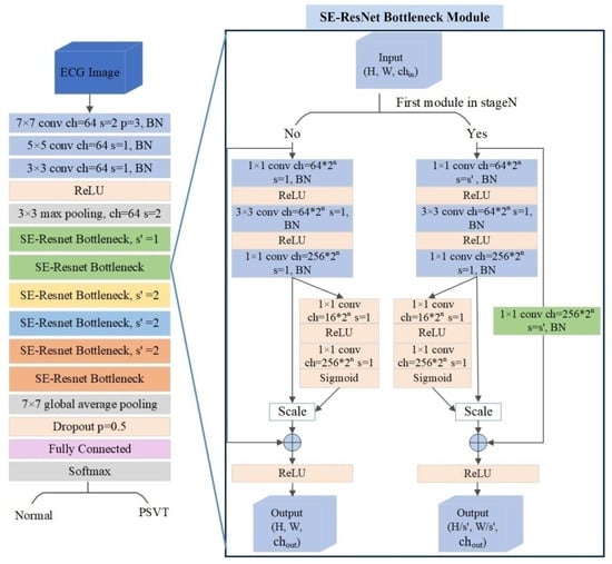 Considering the ECG images consisted of multiple waves, we paid more attention to edge detection, and we set three convolution layers in the initial stage of the network to extract waveform features, as the early layers of the neural network was aimed at detecting edges. Each convolution layer was followed by a batch-normalization layer, which was used to eliminate distribution differences between layers while preserving the sample distribution characteristics. Following the third batch-normalization layer, there was a nonlinear ReLU function and a max-pooling layer [21,22]. Then, the samples had better sparsity and the dimension of the array was reduced on the premise of preserving the characteristics of the sample. Moreover, the SE–ResNet bottleneck module was applied to extract subtle features that were not readily apparent to the naked eye from ECG images. The design of the bottleneck not only reduced the network parameters but also deepened the network depth to study more features. Meanwhile, an attention mechanism that allowed the network to emphasize informative features and to suppress less useful ones was introduced into the bottleneck. To avoid gradient disappearance, between the input of the SE–ResNet Bottleneck module and its output, a 1 × 1 convolution layer was used to adjust the number of channels if the module was at the top of its stage; otherwise, an identity shortcut link was used to allow gradient propagation [23]. Following the last SE–ResNet Bottleneck module, the image was fed to a global pooling layer and a dropout layer, which helped to avoid overfitting. The final output layer (fully connected layer) was activated by using the softmax function, which provided a probability of PSVT. The architecture of the model is shown in Figure 3.