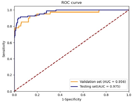 ROC of the screening performance on the validation set and testing set: AUC, area under the curve; ROC, receiver–operating characteristic curve.