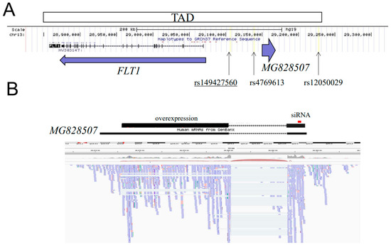 The MG828507 and FLT1 genes are located within the same TAD. The TADs are megabase-scale genomic domains, in which certain DNA regions show a significantly higher interaction frequency with other DNA regions within the domain, compared with those outside of the domain [29,30]. TADs are generally separated by an insulating protein complex, including CTCF, and build a common framework for contact between regulatory elements and genes within the domain [31]. One possibility in relation to our current investigation is that MG828507 is an enhancer of regulatory RNA for the FLT1 gene. Hence, the promoter of the FLT1 gene and MG828507 may interact within the TAD, forming a transcriptional complex via a loop conformation. Although Genhancer analysis did not indicate any interaction between MG828507 and FLT1, the public databases indicate a positive acetylation of H3K27 at the 5′ end of MG828507 exon, suggesting a possible enhancer function of MG828507 (data not shown).