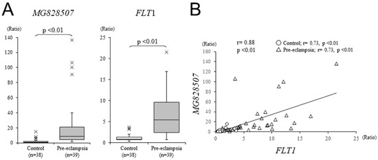 RNA recovered from the placental samples was subjected to quantitative real-time RT-PCR to quantify MG828507 and FLT1 gene expression. A Superscript III First-Strand Synthesis SuperMix for RT-PCR (Invitrogen, Grand Island, NY, USA) using random primers was employed to produce single-stranded cDNA from the total RNA. The 18S rRNA housekeeping gene 18S rRNA (Hs99999901_s1) was used to normalize the mRNA concentrations, because other genes commonly used as such a control are often regulated by estrogen [23]. RT-PCR reactions were performed in triplicate using a THUNDERBIRD Probe qPCR Mix (Toyobo, Osaka, Japan) in a final volume of 20 µL. The cycling conditions for PCR amplification were 1 min at 95 °C, followed by 40 cycles of 15 s at 95 °C, and 1 min at 60 °C. PCR primers and TaqMan probes for the FLT1 gene were purchased commercially (Hs0105296_m1, Thermo Fisher Scientific, Tokyo, Japan), and those for the MG828507 gene were custom-designed as follows: forward (5′-AAGTCAGCACACAGCTTGAAAGC-3′), reverse (5′-GTCTTGTGCTGTTTGACAAATGG-3′), and Taqman probe (5′-ACTACAGGCCTTTCTT-3′).