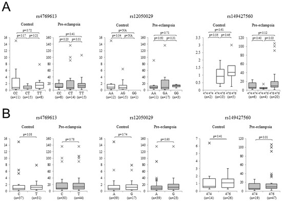 Correlations between MG828507 expression and the indicated genetic variants. (A) Comparison of the placental mRNA levels by variant genotype. Data for rs4769613 (left), rs12050029 (center), and rs149427560 (right) are shown. In each panel, data for the normotensive placental controls are shown on the left, and those from pre-eclamptic cases are shown on the right. (B) Comparison of the placental mRNA levels by variant allele type. The boxes indicate the 25th and 75th percentiles. The bands near the middle indicate the median values. The bars indicate the 1.5 interquartile ranges, with the outliers specifically marked. Sample numbers and p values are shown in each panel.