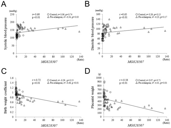 Correlations between MG828507 expression and systolic blood pressure (A), diastolic blood pressure (B), normalized birth weight (C), or placental weight (D). Open circles indicate control uncomplicated pregnancies, and open triangles indicate pre-eclampsia. Regression lines are shown with correlation coefficients and p values.