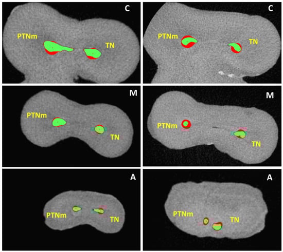 2D matching of pre-operative (green) and post-shaping (red) canal sections at the apical (A), point of maximum curvature (M), and coronal (C) levels of analysis in both groups.