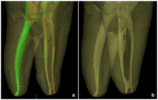 An extracted tooth model is usually transferable to the clinical setting and pre-operative homogeneity between samples is essential to ensure an adequate standardization [,]. In this micro-CT study, baseline homogeneity for 3D and 2D parameters was assumed, in agreement with previous observations []; however, the small sample number could be considered a limitation. Micro-CT analysis enables the non-invasive evaluation of pre- and post-operative root canal morphology, being an effective indicator of instrument shaping ability [,,]. In this study, the superposition of the scanned volumes and the analysis of the root canal cross sections resulted in an accurate comparison of the shaping outcomes for the tested instruments in the apical, maximum curvature, and coronal levels of lower molar mesial canals []. These levels were selected as those most representative of the critical shaping portions [], especially in the lower molar mesial canals that tend to require the most involved endodontic treatment of any teeth, with their complex anatomy often leading to procedural aberrations [].