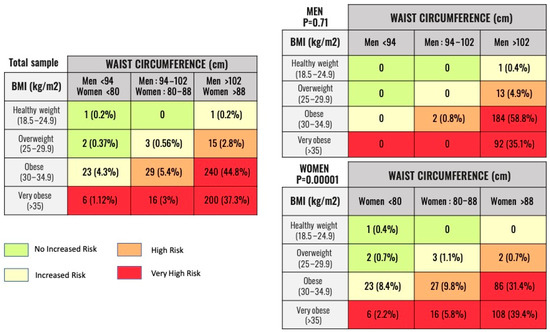 Not all patients with obesity as determined using BMI have the alterations in cardiovascular risk factors that are expected from excess body fat. Therefore, other parameters should also be used in order to more precisely define their risk. WC, for example, is a useful index of abdominal adiposity. For patients in every BMI category, an elevated WC was predictive of an increased accumulation of visceral adipose tissue (VAT) and mortality. Kissebah and Björntorp first reported that in all BMI categories, a greater proportion of abdominal fat was predictive of insulin resistance and hypertriglyceridemia. This finding is in line with our results and provides the first evidence of the limitations of BMI in a patient’s health risk assessment [19,20]. Current guidelines recommend sex-specific WC values (>102 cm in men and >88 cm in women) to define abdominal obesity [21]. However, these cutoff values are not BMI-specific. A WC of 103 cm does not describe the same adiposity phenotype in a man with a BMI of 29 Kg/m2 as in another with a BMI of 35 Kg/m2. In this case, the first man has central obesity with excess VAT and should be considered a high-risk patient. In our sample, 54.5% had class I obesity and 44.8% had abdominal obesity; in contrast, 41.42% had class II obesity and only 37.3% had abdominal obesity. Neither BMI nor WC should be used on their own to define individuals with obesity [22]. In a metanalysis of 11 prospective cohort studies, Cerhan et al. observed that WC was positively associated with mortality within every BMI category [23]. Similarly, de Hollander et al. reported that age-adjusted and smoking-adjusted mortality was greater for those with an elevated WC in every BMI category [24]. It appears that the amount of intra-abdominal adipose tissue—not subcutaneous adipose tissue—critically correlates with the atherogenic and diabetogenic metabolic abnormalities observed among individuals with obesity, an assertion supported by the results of this study [25]. These findings provide a plausible mechanism by which lower BMI values in an individual with a high-risk WC would entail increased adverse health risk, especially for older adults such as those in our study, whose mean age was 64 years [26].