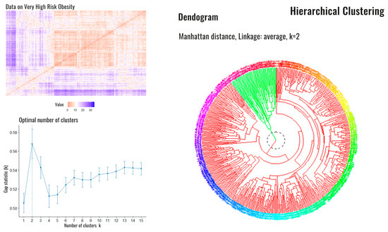 Dissimilarity matrix, optimal number of clusters and dendrogram corresponding to high-risk patients. Legend: Dissimilarity matrix (upper left), the optimal number of estimated Clusters (down left). On the right side, the dendrogram is shown with the presence of the two clusters: cluster 1 (red) and cluster 2 (green).