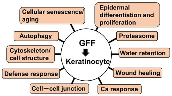 In the GO category of cell aging, the expression of calreticulin (CALR) was downregulated, whereas that of PLK2 was upregulated (Table 1 and Table 3). Meanwhile, the expression of the genes COL7A1, DLL1, and WNT10A (GO category: epidermis development); DDX60, DHX58, and PSMB9 (positive regulation of defense response); DNAJB9, HERPUD1, HSP90B1, SDF2L1, and SEL1L (proteasomal protein catabolic process); GJB2, HEG1, and MICALL2 (cell–cell junction assembly); SYT8 (cellular response to calcium ion); and DST (microtubule-based movement) was consistently decreased by GFF (Table 2 and Table 3). In contrast, the expression of the genes GAL (epidermis development) and SERPINB2 (regulation of wound healing) was augmented by GFF. In addition to SERPINB2, GFF also upregulated the expression of the SERPINB1 and SERPINB7 genes (Table 1 and Table 3). However, the biological significance of the modified expression of these genes in keratinocytes remains obscure.