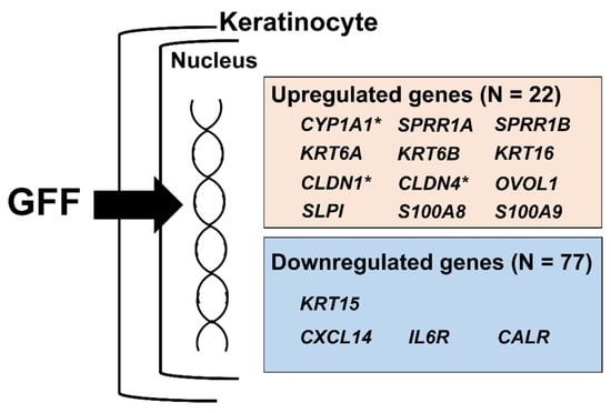 The GFF-formulated moisturizing product is a popular skincare product used widely around the world. Two independent clinical trials have shown that its daily application for 4 weeks significantly attenuated not only the intensity, but also the fluctuation of facial redness, roughness, and pore dilation []. Topical GFF also stabilized the mask-induced exacerbation of fluctuations in facial redness and pore dilation []. The clinical efficacy of GFF may be partly attributable to the fact that it works as an antioxidative AHR agonist [,,,,]. However, the molecular effects of GFF on keratinocytes are not fully understood.