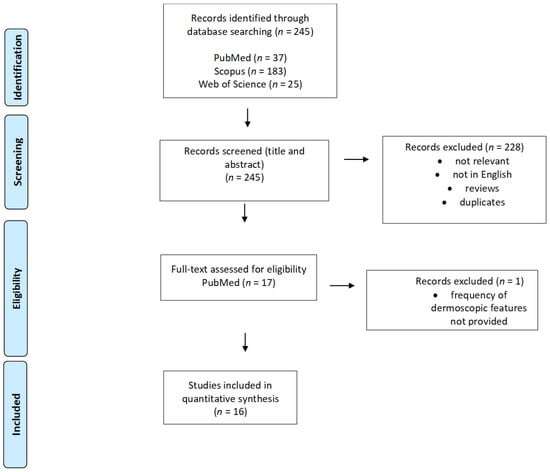 Of the 245 records found initially in PubMed, Scopus, and Web of Science databases, a total of 17 articles were assessed full-text after title and abstract screening. Of these 17 articles, one was excluded as it did not meet the inclusion criteria, and none were included after reference screening. Thus, in total, 16 articles were included in this review (3 case series and 13 case reports), analysing 148 patients with different CM variants. The flow chart reporting the study selection process is presented in Figure 1.