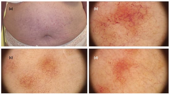 (a) Maculopapular cutaneous mastocytosis (telangiectasia macularis eruptiva perstans clinical subtype)—clinical presentation. (b–d). Dermoscopy shows reticular vascular pattern (thin reticular telangiectasias) over erythematous background (FotoFinder, Medicam 800 HD, FotoFinder Systems GmbH, Bad Birnbach, Germany; ×20 magnification, immersion gel).