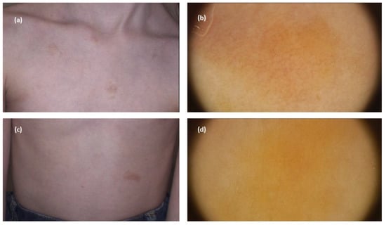 (a,c) Maculopapular cutaneous mastocytosis (plaque-type mastocytosis clinical subtype)—clinical presentation. (b) Dermoscopy shows reticular vascular pattern (thin reticular telangiectasias) over yellow background. (d) Dermoscopy shows yellow structureless areas (FotoFinder, Medicam 800 HD, FotoFinder Systems GmbH, Bad Birnbach, Germany; ×20 magnification, immersion gel).