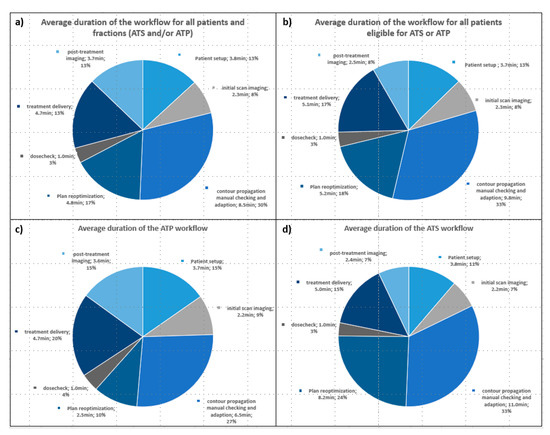 Diagrams of the consecutive substeps of the 1.5 T MR-Linac Unity workflow with average duration per substep. (a) All patients 1–16, including patients 1–4 who received only ATP. (b) Subgroup of patients 5–16, who were eligible for ATP or ATS workflow according to the attending radiation oncologist. (c) All ATP fractions of all patients. (d) All ATS fractions of all patients. ATP = adapt to shape, rigid virtual couch shift and reoptimization, ATS = adapt to shape, recontouring and optimization.