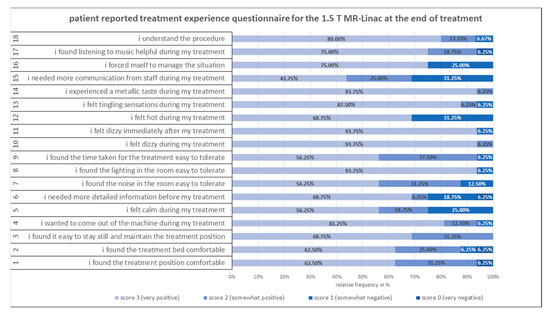 - Barnes, H.; Alexander, S.; Bower, L.; Ehlers, J.; Gani, C.; Herbert, T.; Lawes, R.; Møller, P.K.; Morgan, T.; Nowee, M.E.; et al. Development and results of a patient-reported treatment experience questionnaire on a 1.5 t mr-linac. Clin. Transl. Radiat. Oncol. 2021, 30, 31–37. [Google Scholar] [CrossRef] [PubMed]