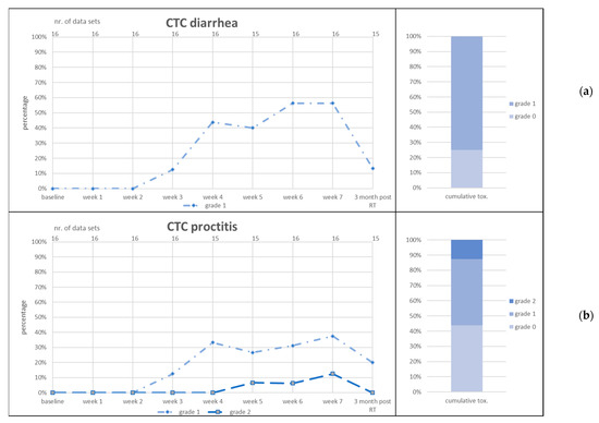 Acute gastrointestinal (GI) toxicity scored as CTC diarrhea (a) and CTC proctitis (b). RT = radiotherapy. Left graphs: number of patients in percent (y-axis) who reported the toxicity item at the given point of time (lower x-axis). Number of data sets in upper x-axis. Right graphs: cumulative toxicity of the given item up to three months post RT.