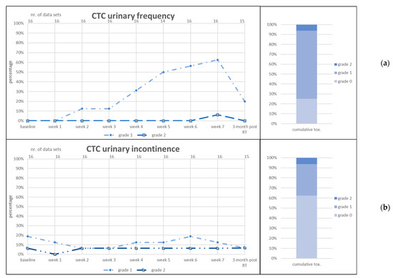 Acute genitourinary (GU) toxicity scored as CTC urinary frequency (a) and CTC urinary incontinence (b). RT = radiotherapy. Left graphs: number of patients in percent (y-axis) who reported the toxicity item at the given point of time (lower x-axis). Number of data sets in upper x-axis. Right graphs: cumulative toxicity of the given item up to 3 months post RT.