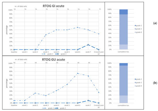 The following supporting information can be downloaded at: https://www.mdpi.com/article/10.3390/jcm11164651/s1, Figure S1: Patient-reported outcomes (pro) of acute genitourinary (GU) toxicity scored as CTC GU pain (a) and CTC GU urgency (b). RT = radiotherapy. Left graphs: number of patients in percent (y-axis) who reported the toxicity item at the given point of time (x-axis). Right graphs: cumulative toxicity of the given item up to 3 months post RT.; Figure S2: Patient-reported outcomes (pro) of acute genitourinary (GU) toxicity scored as CTC GU frequency (a) and CTC GU incontinence (b). RT = radiotherapy. Left graphs: number of patients in percent (y-axis) who reported the toxicity item at the given point of time (x-axis). Right graphs: cumulative toxicity of the given item up to 3 months post RT.; Figure S3: Patient-reported outcomes (pro) of acute gastrointestinal (GI) toxicity scored as CTC GI appetite (a) and CTC GI abdominal pain (b). RT = radiotherapy. Left graphs: number of patients in percent (y-axis) who reported the toxicity item at the given point of time (x-axis). Right graphs: cumulative toxicity of the given item up to 3 months post RT.; Figure S4: Patient-reported outcomes (pro) of acute gastrointestinal (GI) toxicity scored as CTC GI diarrhea (a) and CTC GI fecal incontinence (b). RT = radiotherapy. Left graphs: number of patients in percent (y-axis) who reported the toxicity item at the given point of time (x-axis). Right graphs: cumulative toxicity of the given item up to 3 months post RT.; Figure S5: Patient-reported outcomes (pro) of acute toxicity scored as CTC insomnia (a) and CTC fatigue (b). RT = radiotherapy. Left graphs: number of patients in percent (y-axis) who reported the toxicity item at the given point of time (x-axis). Right graphs: cumulative toxicity of the given item up to 3 months post RT.; Figure S6: Patient-reported outcome of ICIQ score (a), IPS score (b), quality of life (c) and overall health status (d). (c,d) are scored on an ordinal scale from 0 (worst) to 7 (optimal).