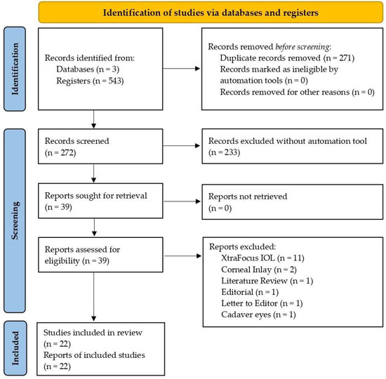 This systematic review was carried out by searching the PubMed, Web of Science and Scopus databases on 15 July 2022. A Cochrane search had retrieved zero results. The study was performed according to the recommendation of the Preferred Reporting Items for Systematic Reviews and Meta-Analyses (PRISMA) [32,33]. An initial search was conducted, focused on obtaining case studies of small aperture IOLs in cataract surgery. The search strategy was “(Small Aperture OR Pinhole OR IC-8) AND (Intraocular Lens OR IOL OR Cataract Surgery OR Lensectomy Surgery OR Refractive Surgery)”. From them, a total of 543 articles were identified, which were evaluated and selected according to the inclusion and exclusion criteria. The inclusion criteria were: (1) small aperture IC-8 IOL in standard cataract, irregular cornea with or without prior surgery and ocular trauma. The exclusion criteria were as follows: (2) narrative reviews; (3) animal studies; (4) editorials or letters to the editor; (5) publications within XtraFocus Small Aperture EDOF IOL; (6) articles without findings or conclusions; (7) articles in nonindexed scientific journals.