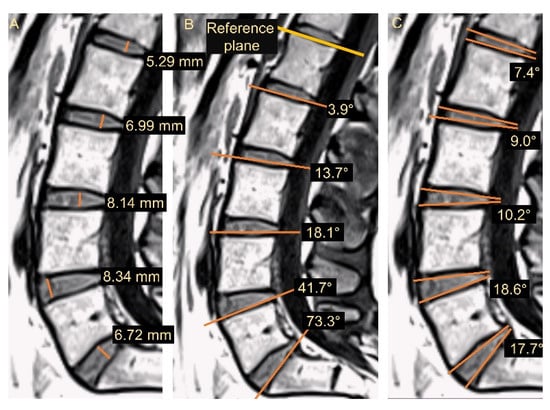 Illustration of the disc measures estimated in the study. (A) The disc height, (B) the tilt angle for L5–S1, and (C) disc angle for all IVDs.