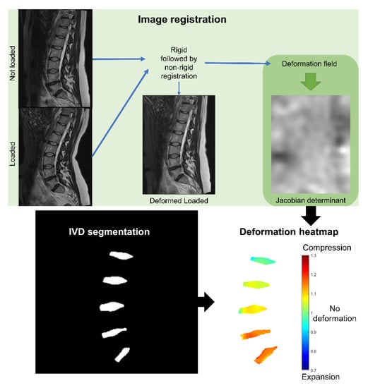 Schematic illustration of the method to measure the intradiscal deformation. The T2-weighted image of the loaded lumbar spine was rigidly and then non-rigidly transformed to the space of the MR image of the unloaded spine. The deformation field, retrieved from the registration, was used to calculate the Jacobian determinant. The Jacobian determinant in the IVDs, which represented the intradiscal deformation, was displayed in detail as heatmaps, where the IVDs were selected automatically using automatic segmentation of the IVDs.