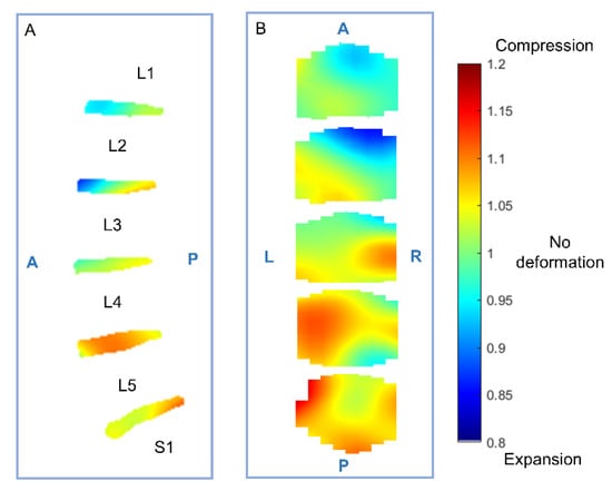 Heatmaps of the intradiscal deformation. Displayed as a sagittal projection (A), and a head–feet projection (B), where a Jacobian determinant larger than 1 represents compression and smaller than 1 represents expansion. Larger compression was found posteriorly in the lower lumbar spine, and generally, the compression showed a left asymmetric distribution pattern.