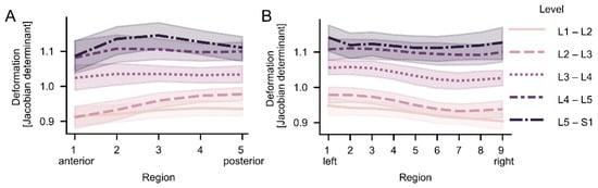 In general, the intradiscal deformation varied with the spine level, where larger deformation (compression) was found in discs at the lower levels of the spine (Figure 3 and Figure 4). The difference in the intradiscal deformation between different spine levels was statistically verified (mean range: 1.12 (L5–S1) to 0.928 (L1–L2), p < 0.001). Further, the intradiscal deformation displayed overall a regional variation both in the anterior–posterior and left–right directions (p = 0.007; Figure 4).