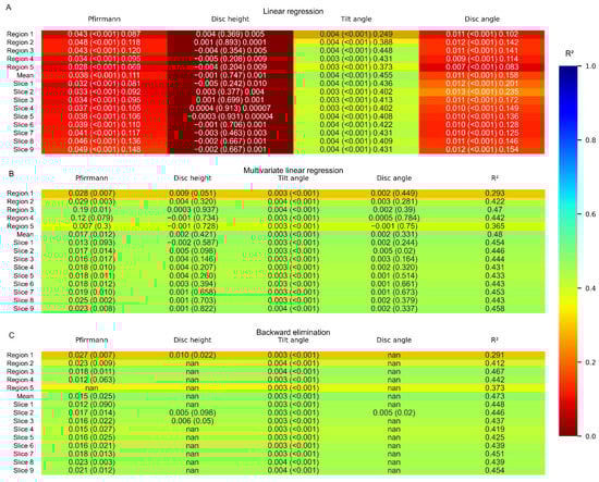 Linear regression analysis. (A) Univariate linear regression, (B) multivariate linear regression and (C) multivariate linear regression with backward elimination colored according to the coefficient of determination for the regression between the deformation and the disc characteristics. The cells contain β (p-value) R2 for A and β (p-value) with R2 in a separate column for B and C. Region 1 = anterior, Region 5 = posterior, Slice 1 = left, and Slice 9 = right.
