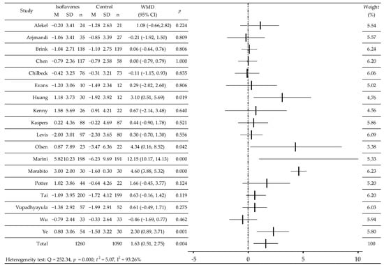 RCT value of BMD was analyzed in 18 RCTs before and after administration of isoflavones or placebo (Table 1) [25,26,27,28,29,30,31,32,33,34,35,36,37,38,39,40,41,42]. There was a significant increase in BMD [27,30,33,34,36] and a slight upward trend [25,29,39] as well as in comparison with the control group, slowing down of bone loss [26,28,35,37,38,40,41] or its reduction [31,32,42]. In the random effects model, the weighted average difference (WMD) was 1.63 (95% CI: 0.51, 2.75)%, p = 0.0042; Q = 252.34, p = 0.000; t2 = 5.07, I2 = 93.26% (Figure 2). Additional meta-analysis after excluding two research studies [27,36] with extreme results that could affect the final result confirmed the moderate, statistically significant effect of isoflavones on BMD L1-L4: WMD 0.48 (0.09–0.88)%, p = 0.0166, Q = 22.2745, p = 0.1008; t2 = 0.1895; I2 = 32.66%. Meta-analysis of the subgroups showed a statistically significant effect of isoflavones consumption on BMD in Caucasian women, over 5 years after menopause, after 12 and 24 months of observation, regardless of the dose of isoflavones/d, and especially after receiving Gen (Table 2).