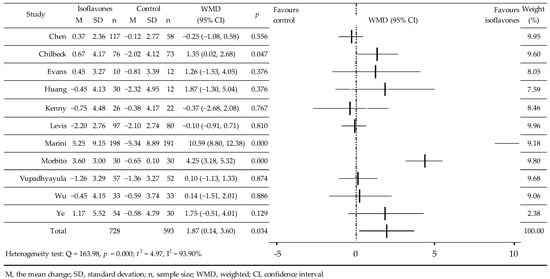 In 11 RCTs, the influence of isoflavones on BMD was studied. In these, 1321 women participated, including 728 in the active groups and 593 in the control groups [27,28,32,33,34,35,36,38,39,40,42]. Two studies used IBS enriched with isoflavones [35,39], in the others, standardized isoflavones, and in two of them, Gen [27,36]. In three cases, the isoflavones value [28,33,34] was averaged (Table 1). In four studies, an increase in BMD [27,33,35,36] was observed compared to the control—deceleration of bone loss was noted [32,34,38,42] and three studies saw decrease [28,39,40]. Meta-analysis of the data showed a significant effect of isoflavones on BMD, WMD = 1.87 (95% CI: 0.14, 3.60)%, p = 0.0342; Q = 163.98; p = 0.000; t2 = 4.97, I2 = 93.90% (Figure 3). Supplementary meta-analysis after excluding two studies [27,36] showed a small, but statistically non-significant effect on FN, BMD: WMD = 0.21 (−0.25, 0.66)%, p = 0.3772; Q = 8.1814, p = 0.4160; t2 = 0.01185; I2 = 2.22%. In the analysis of the subgroups, a significant increase in BMD was observed after the admission of Gen-significant, however, with a borderline level of significance in the western population and following a period of 5–10 years after menopause (Table 2).