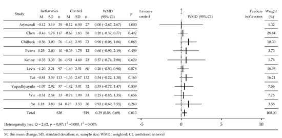 The effects of isoflavones on BMD were analyzed in 10 RCTs [28,31,32,33,35,38,39,40,41,42]. A total of 1157 women took part in these, 638 in intervention groups and 519 in control groups, which took soy isoflavones extract [28,32,33,39,40,41,42] or products with IBS enriched with isof [31,35,38], (Table 1). Compared with the control group, a negligible increase in BMD was noted [33,35] as well as a slight slowdown in bone density decrease [28,31,32,38,39,40,41,42]. Meta-analysis revealed a small but significant effect isoflavones on BMD, without statistical heterogeneity, WMD = 0.39 (95% CI: 0.08, 0.69)%, p = 0.013; Q = 2.62, p = 0.97; t2 = 0.00, I2 = 0.00% (Figure 4). Analysis of the subgroups showed significant effects of the isoflavones at 90 mg/day, isoflavones mixtures, and after 24 months of observation; borderline significance of BMD increases in the western population and negligible effect of elapse of time from menopause (Table 2).