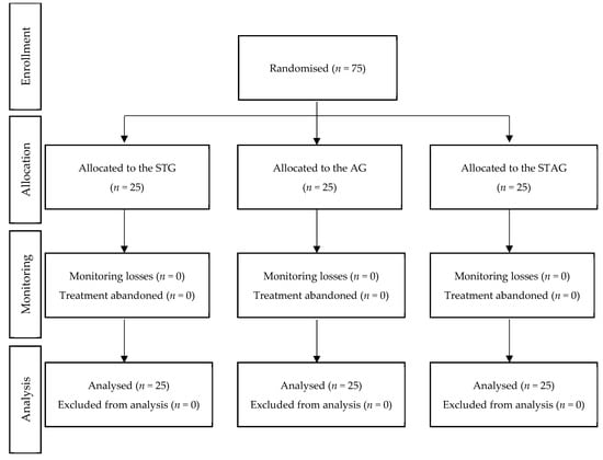 Flowchart according to CONSORT Statement for the Reporting of Randomised Trials. STG: Soft tissue group; AG: articulatory group; STAG: soft tissue and articulatory group.