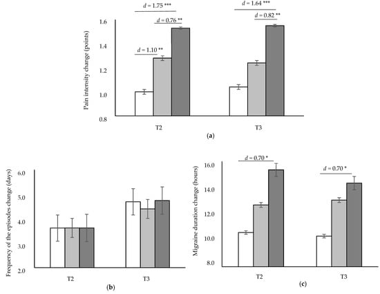 The effect of the interventions on variables related to pain (pain intensity, frequency of the episodes and migraine duration), migraine-associated disability and impact, emotional state (levels of depression and anxiety), and perception of change were evaluated at three time points (i.e., T1, T2 and T3).