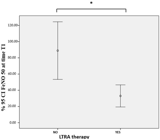 FeNO 50 at time T1: comparison based on LTRA therapy. FeNO: exhaled nitric oxide; LTRA: leukotriene receptor antagonist. *: statistically significant difference; LTRA therapy vs. no LTRA therapy: 30.83 ± 24.30 vs. 88.93 ± 77.96; p = 0.009.
