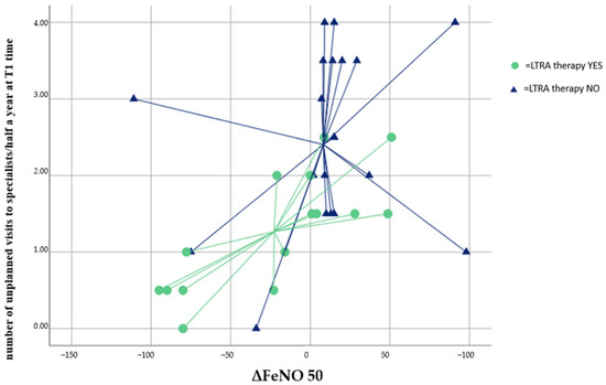 Among the subjects who presented an improvement in FeNO (Group 1; ΔFeNO < 0) compared to the others (Group 0; ΔFeNO ≥ 0), there were a significantly greater number of patients on LTRA therapy (66.7% vs. 29.2%; p = 0.037).