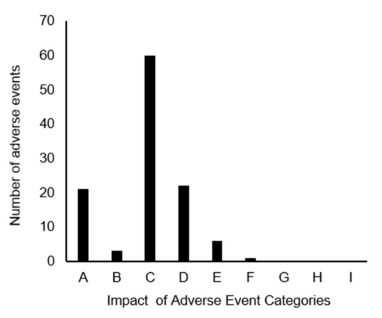 The degree of impact of adverse events on patients: category A (no error); categories B to D (error but no harm); categories E to H (error and harm): and category I (error and death), classified based on the National Coordination Council for Medication Error Reporting and Prevention index.