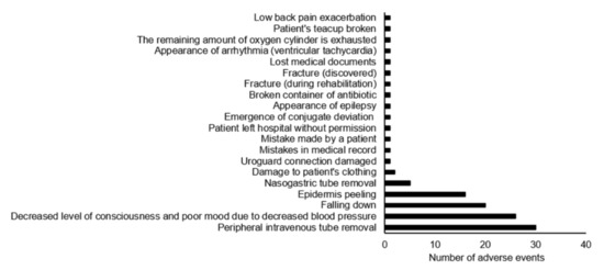 In this study, the number of AEs was not particularly high among therapists with few years of working experience. In our previous report, there was no relationship between the occurrence of SAEs and the number of working years of the therapist in charge of the patient, indicating the need to be aware of the incidence regardless of experience [17]. In addition, neurosurgery patients had a higher incidence of AEs, with the most common AEs involving peripheral intravenous tube removal. Patients with cerebrovascular disease often suffer from symptoms that considerably reduce cognitive function and activities of daily living, including impaired consciousness, higher brain dysfunction, and motor paralysis [19]. In addition, the number of AEs may have been higher in the early stage of cerebrovascular disease because of the use of intravenous infusion through the peripheral intravenous tube [20]. Thus, patients with cerebrovascular disease may require special attention due to the possible occurrence of AEs.