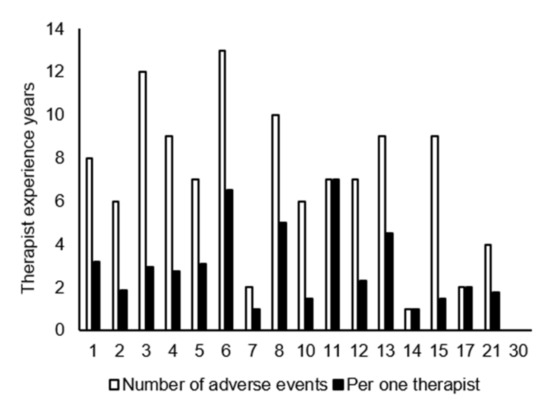 Number of adverse events by years of therapist experience. Per one therapist means the number of occurrences divided by the number of therapists enrolled in each year of experience. A clerical staff member was excluded for causing one adverse event.