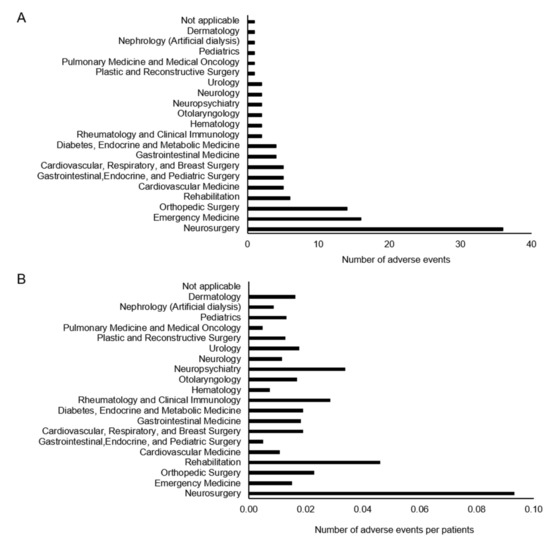 Number of adverse events by clinical department. (A) Number of adverse events by clinical department. (B) Number of adverse events by clinical department converted per patient. (B) results were obtained by dividing the number of adverse events by the number of people referred to the department of rehabilitation.