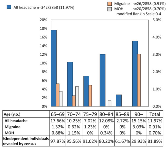 Our previous study on the headache disorder prevalence in the same region among the working age revealed that the headache disorders, migraine, and MOH prevalence is 41.05%, 4.26%, and 2.32% [4]. On the other hand, those among the elderly were 11.97%, 0.91%, and 0.70%. Considering these results, this study on the elderly’s prevalence suggested similar results: the prevalence of headache disorders progressively decreases with advancing age, which is still consistent more than 20 years later [6,7], although healthy life expectancy becomes longer.