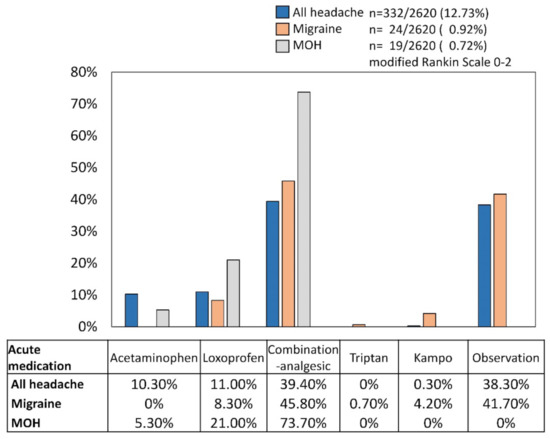 The proportion of acute medication use in all headache disorders, migraine, and medication overuse headache (MOH) respondents. The respondents all lived independently (modified Rankin Scale 0–2).