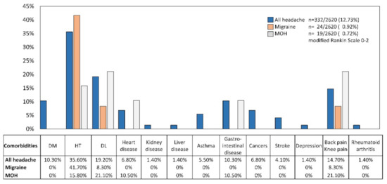 The proportion of comorbidities in all headache disorders, migraine, and medication overuse headache (MOH) respondents. The respondents all lived independently (modified Rankin Scale 0–2).