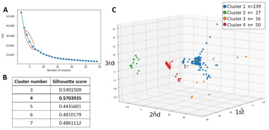 Results of clustering. (A): The elbow chart calculated by k-means++, suggesting four to six is the appropriate number of clusters. (B): The silhouette score was calculated, and that of the 4 clusters was highest as 0.5704. (C): The clusters are plotted in the three-dimensional space, of which the axes were calculated by the principal component analysis consisting of the 25 variables. SSE; sum of squared errors.