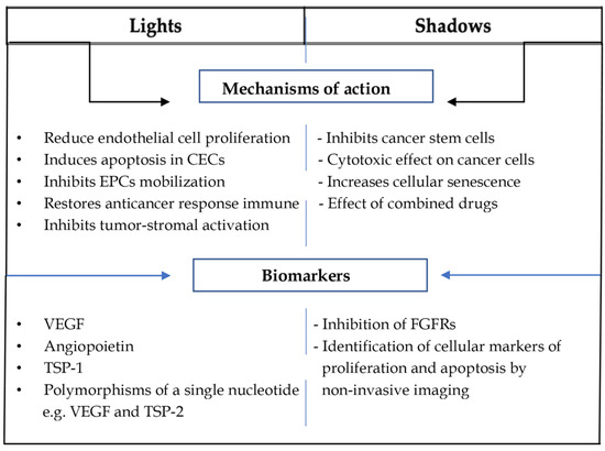 In the preclinical setting, we evaluated as “lights,” the well-described mechanisms that prevent or block angiogenesis, mainly by inhibiting VEGF and, to some extent, the effect of mCHT immunomodulation.