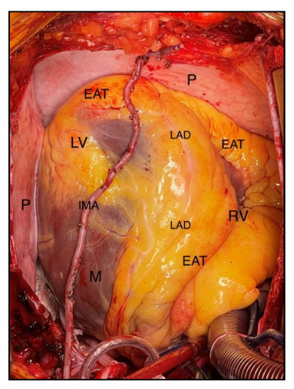 Intra-operative view of EAT. Left ventricle (LV); Right ventricle (RV); Left anterior descending artery (LAD); Internal mammary artery (IMA); Epicardial adipose tissue (EAT); Myocardium (M); Pericardium (P). Photo collected from own practice and obtained with patient’s consent.